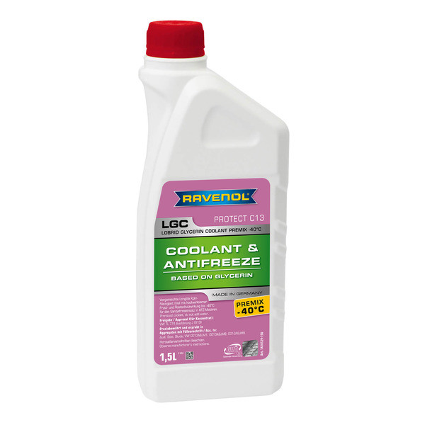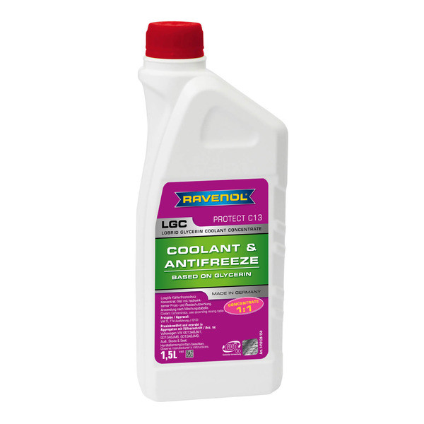 RAVENOL LGC Lobrid Glycerin Coolant Premix -40°C - готовый антифриз лилового цвета, с добавлением 20% глицерина. Соответствует спецификации VW TL-774-J (G13) и является аналогом оригинальному антифризу G013A8JM1, G013A8JM8, G013A8JM9.